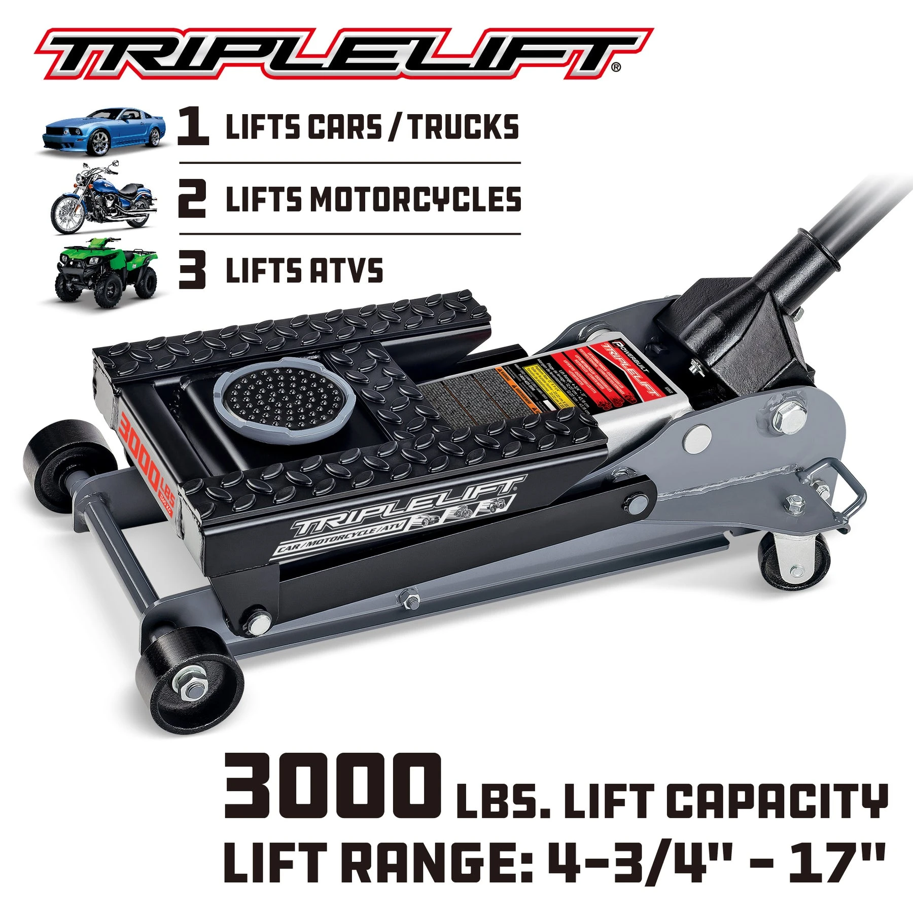 Get rid of your floor jacks, transmission jacks, and ATV jacks. The 3000 Lb. Triple Lift jack is three jacks in one. This innovative jack has a patented design that lets you lift cars, trucks, motorcycles, or ATVs with ease. The Triple Lift easily lifts just about anything with wheels, works on vehicle transmissions and differentials too. The patent features of this design includes a removable lift saddle and padded lift rails. This flexibility allows the Triple Lift to adapt to multiple types of vehicle frames, including lifting Unibody vehicles, safely. With added built-in tie-down loops, it makes it easy to secure motorcycles in place for added stability. The precision locking design keeps the jack from lowering once raised, eliminating the need to support a lifted vehicle with a separate jack stand.