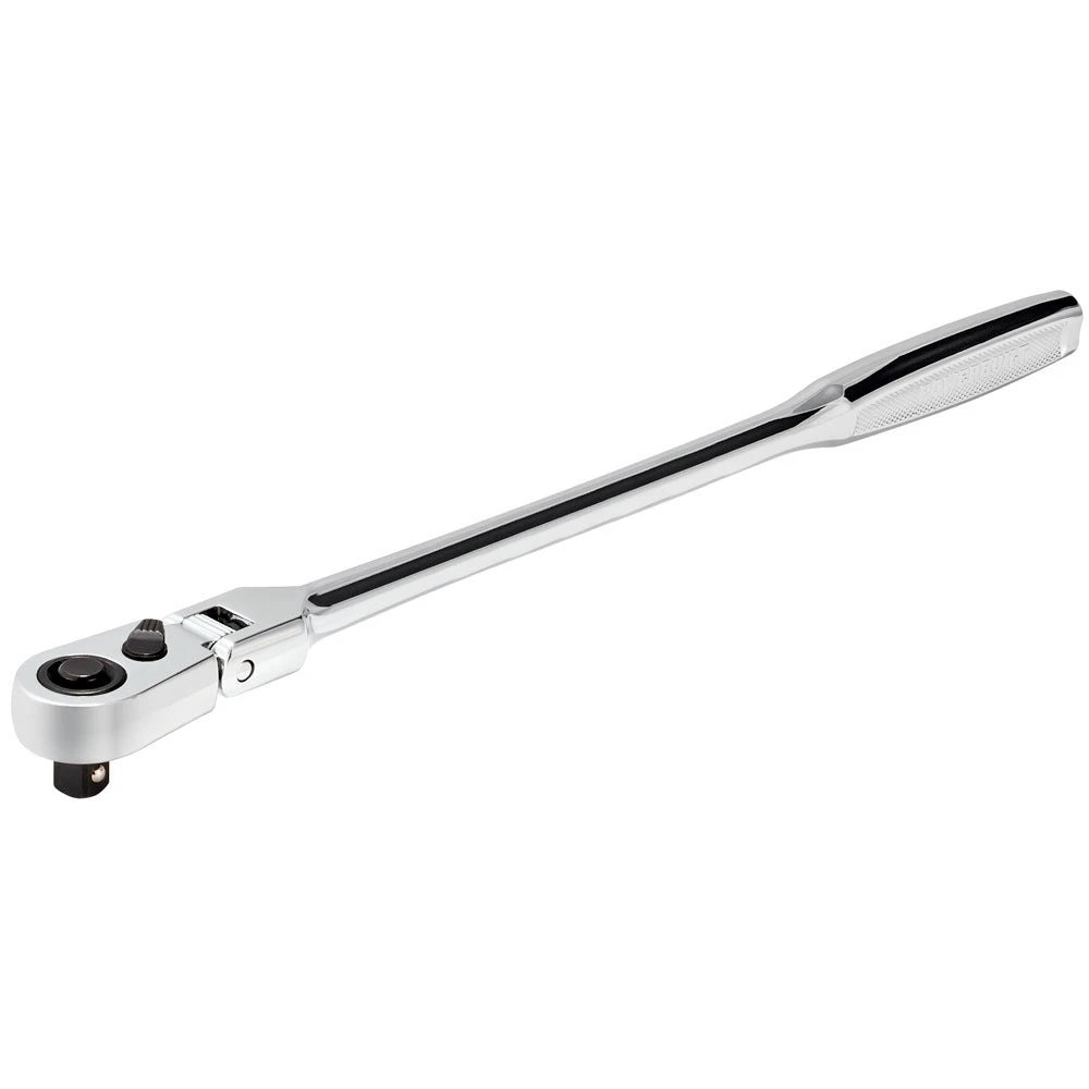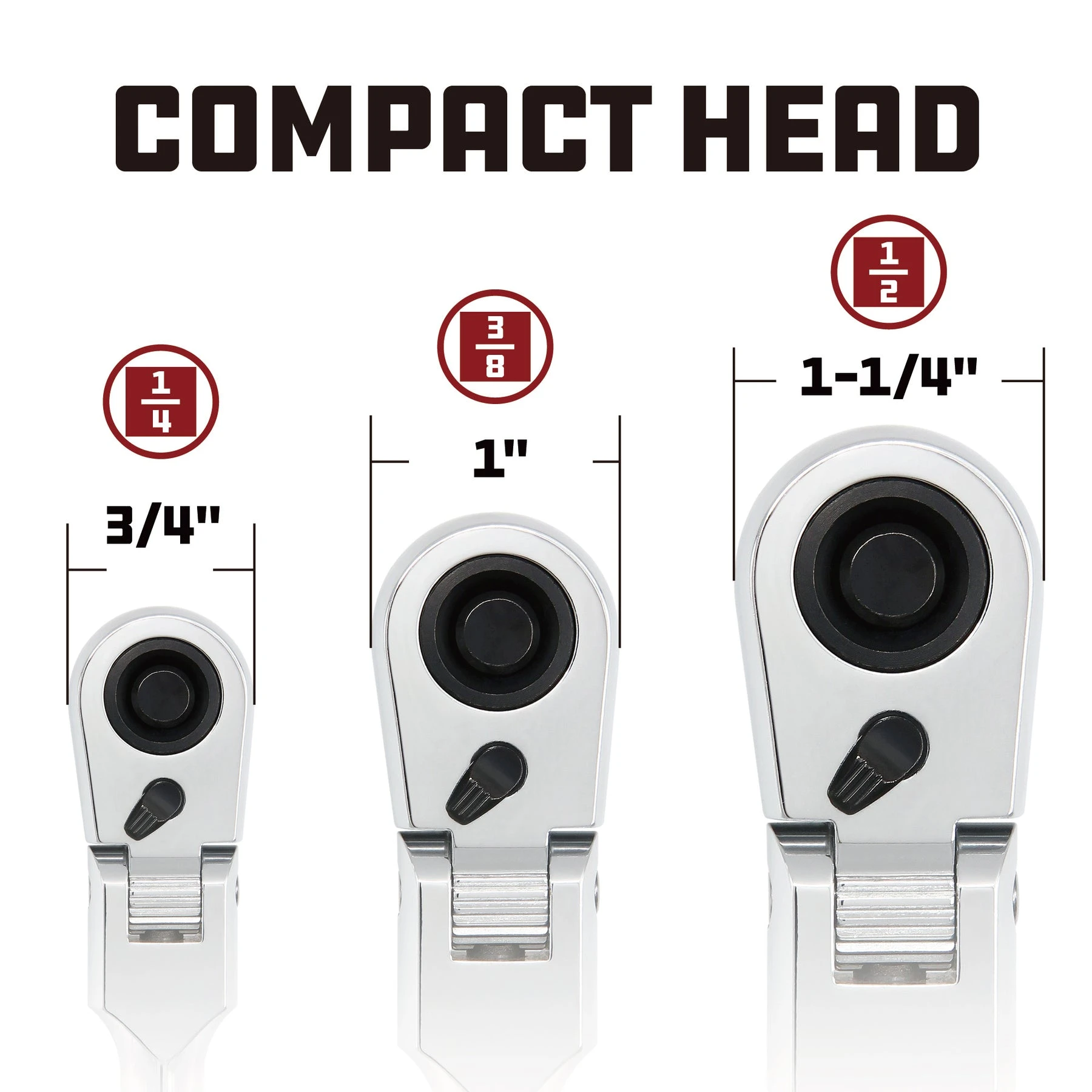 PRECISION CRAFTED: The sealed quick-release button blocks dust and debris and makes socket changes quick and easy. The long reach contour handle fits flat in the palm of the hand adding both comfort and leverage and the thin-profile flex head allows you to swivel the ratchet head up to 180° making it easier to reach into those crowded spaces.