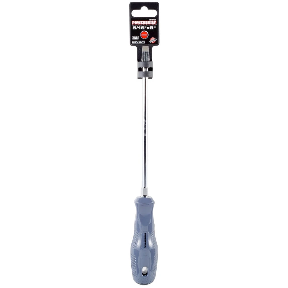 This line of Powerbuilt screwdrivers feature drivers that are built with single injection Acetate handles for maximum comfort and grip. Shafts are constructed of (SVCM) Silicon Vanadium Chrome Magnesium alloy steel for added durability and torque. Large size drivers have hex bolsters, and sizes are marked on the handle caps for easy size identification. All drivers exceed ANSI specifications for quality and performance.