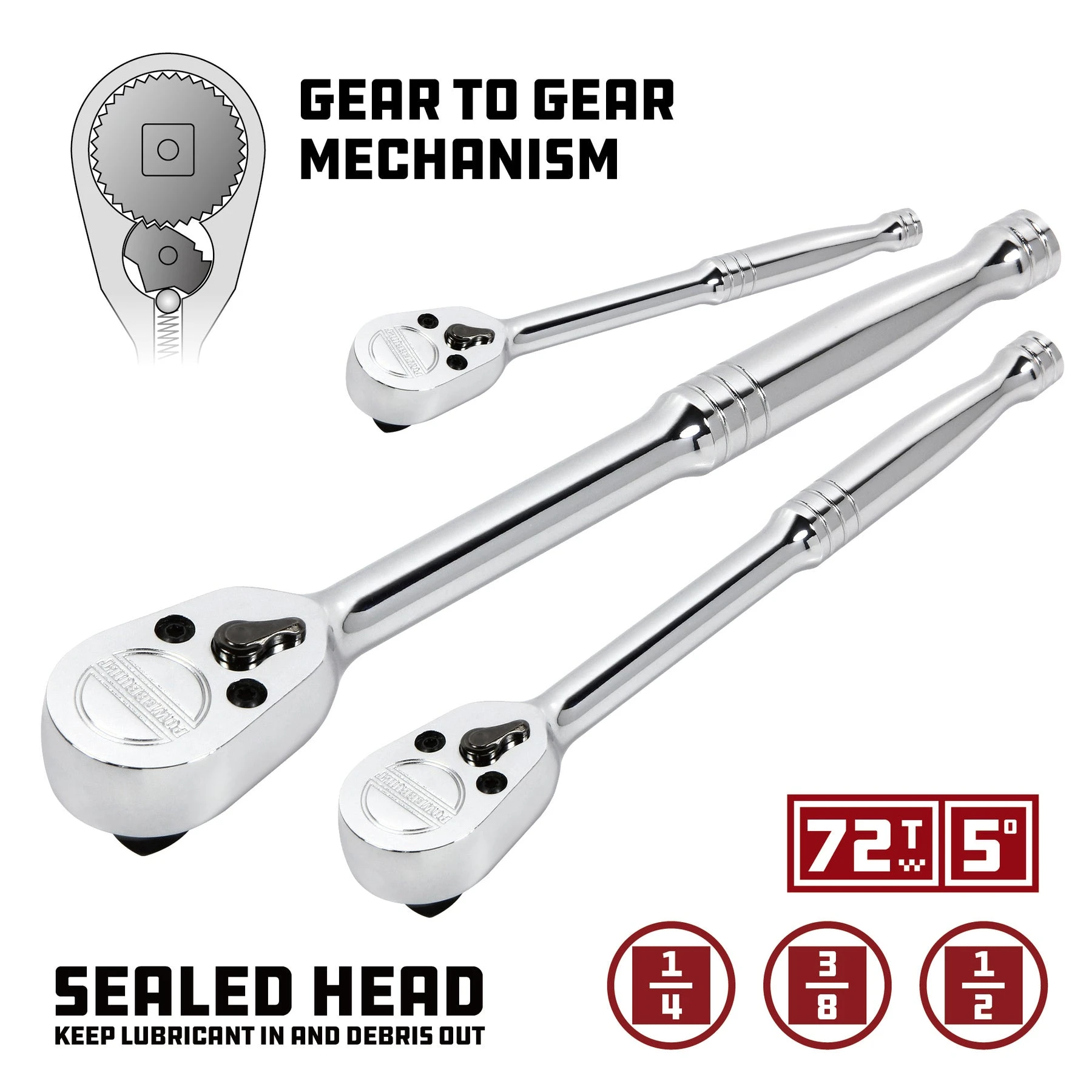 1/4-INCH DRIVE TOOLS:72 tooth gear-to-gear sealed head ratchet, 3-inch and 6-inch extension bars, universal joint