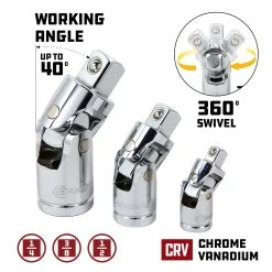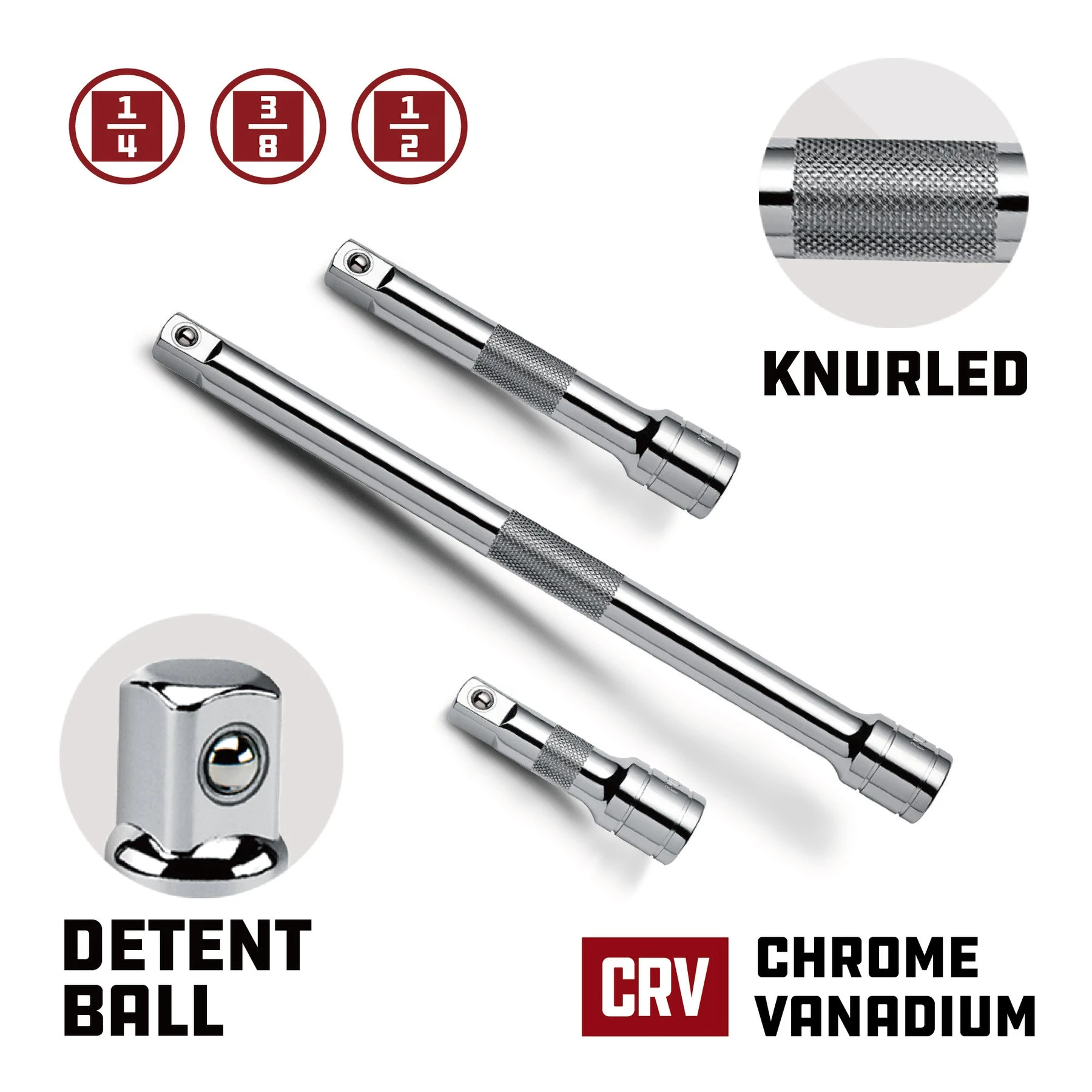 3/8-INCH DRIVE TOOLS: 72-tooth gear-to-gear sealed head ratchet, 72-tooth flex head quick-release ratchet, 3-inch, 6-inch, and 8-inch extension bars, universal joint