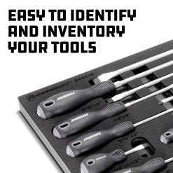 Powerbuilt Professional Technician screwdrivers are built to meet or exceed ANSI specifications. They feature comfortable, high grip handles constructed of premium soft-touch double injection polypropylene. Screwdriver shafts are constructed of Silicon Vanadium Chrome Magnesium (SVCM) for light weight and high strength. Tips are precision ground, then sandblasted and magnetized for added grip. Larger size drivers include a hex bolster at the top of the shaft, and all sizes are marked on the handle caps for easy size ID and selection. Powerful, precise and stylish, Powerbuilt screwdrivers offer the look, feel and performance hard-working Techs deserve. A no questions asked replacement policy and lifetime warranty ensure it’ll be a long-term relationship.