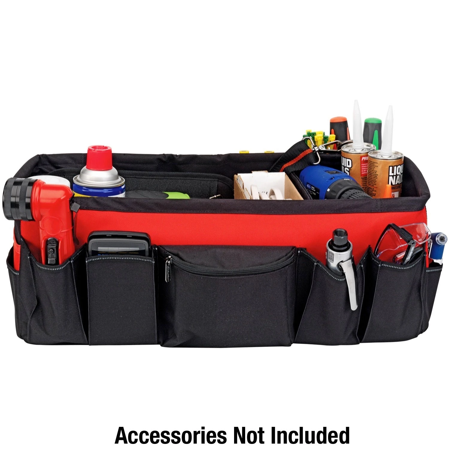 Get your car trunk or truck bed organized in a hurry! Load up this cavernous bag with all those loose cans, cables, gloves, maps, tools and road trip mementos. Go ahead and stuff it to the gills – it’s built to last, using water-resistant 600 denier polyester. In case you ever empty it again, it will fold flat for convenient storage. In addition to the two movable wall dividers in the main compartment, there are 10 exterior pockets and 13 tool loops. A shoulder strap is also included. The finishing touch is the hook and loop strips on the bag bottom that hold everything in place during your autocross sessions. Overall dimensions are 21″ x 9″ x 8-1/2″.
