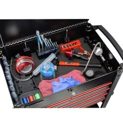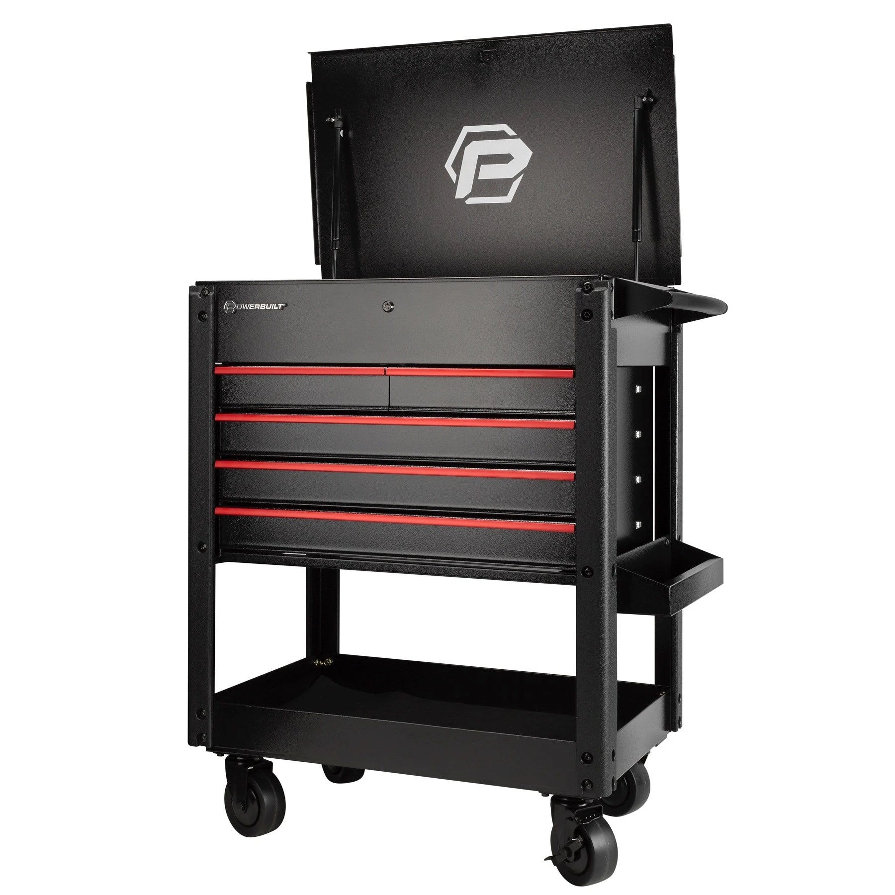 Mobilize and protect your tool investment while gaining easy access to the tools you need with the Powerbuilt heavy-duty 31-inch 5 drawer rolling tool cart. Constructed from 18-gauge powder-coated steel throughout, five drawers that slide on full-length ball bearing guides, 5-inch casters, anodized aluminum pulls, a full-length padded pull/push handle and 44 round tools slots to hold screwdrivers, ratchets, extensions and more, this tool cart is built to last. It even contains a small side tray that can fit spray cans perfectly. The lockable flip-up lid uses twin gas struts for controlled opening action, while the top surface offers additional workspace with the lid closed