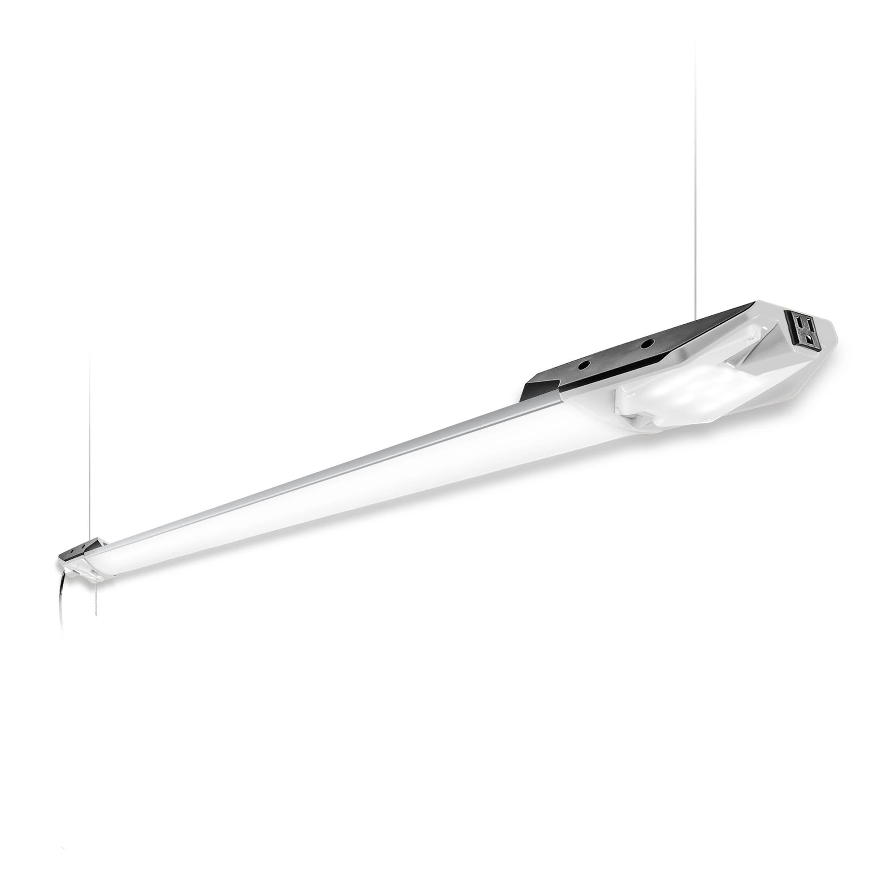 “Light up your garage, shop or man cave with this bright, sleek and efficient overhead task light. Itâs so easy to install, youâll be lighting up your task space in no time at all. Itâs efficient too, using just 65 watts to generate 4500 lumens of bright, natural light at 5000 Kelvin. Thatâs the equivalent light output of ten 45 watt bulbs! Youâll save time, money on your electric bill and your eyesight!