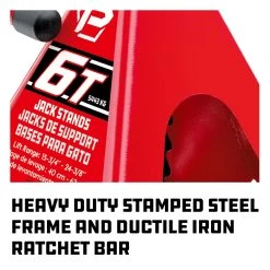 This set of 6 ton jack stands have been stamped from heavy-duty steel and fully welded at all seams, providing strong and dependable protection when under the car. The ductile iron ratchet saddle extensions have a height range of 15-3/4 to 21-3/8 inches, offering 10 different settings to keep your car at just the height you need and the innovative wide-angle four-point stance offers extra stability.