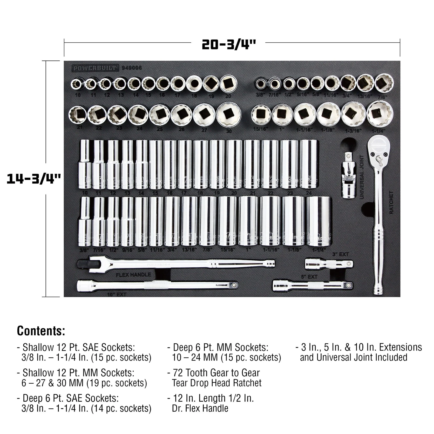 Premium tools and an organized workspace are the marks of professionals and serious home do-it-yourselfers. The Powerbuilt 69 Piece Pro Tech 1/2 Inch Drive SAE and Metric Socket Set provide both. This 69 piece professional level socket set comes with deep and shallow sockets, socket accessories, and drive tools in a laser-cut foam tray designed to drop into any standard toolbox drawer. The innovative Z-Drive sockets are both 6 point and 12 point, for better grip on various fasteners. The 1/2 inch drive tools include a reversible 72 tooth gear to gear ratchet, 3-inch, 5-inch, 10-inch extensions, universal joint, and a 12-inch flex handle. Constructed