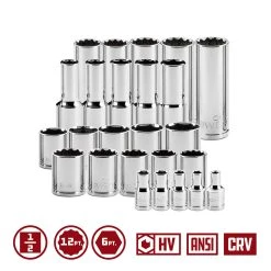 SIZE: SAE Shallow 3/8 inch to 1-1/4 inch (15 pieces); SAE Deep 3/8 inch to 1-1/4 inch (14 pieces); Metric Shallow 6mm – 27mm, and 30mm (19 pieces); Metric Deep 10mm to 24mm (15 pieces)