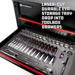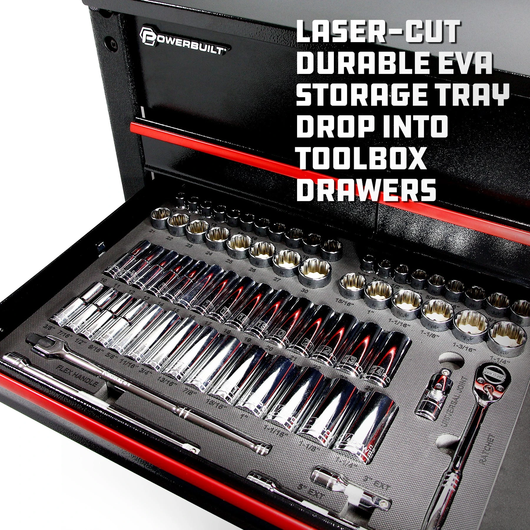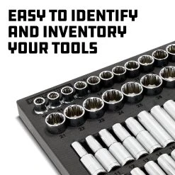 ORGANIZED DRAWER TRAY: The socket set comes in a laser cut EVA foam tray (14-3/4 inches by 20-3/4 inches) designed to fit in toolbox drawers to keep tools organized and secure; socket size markings allow for quick inventory