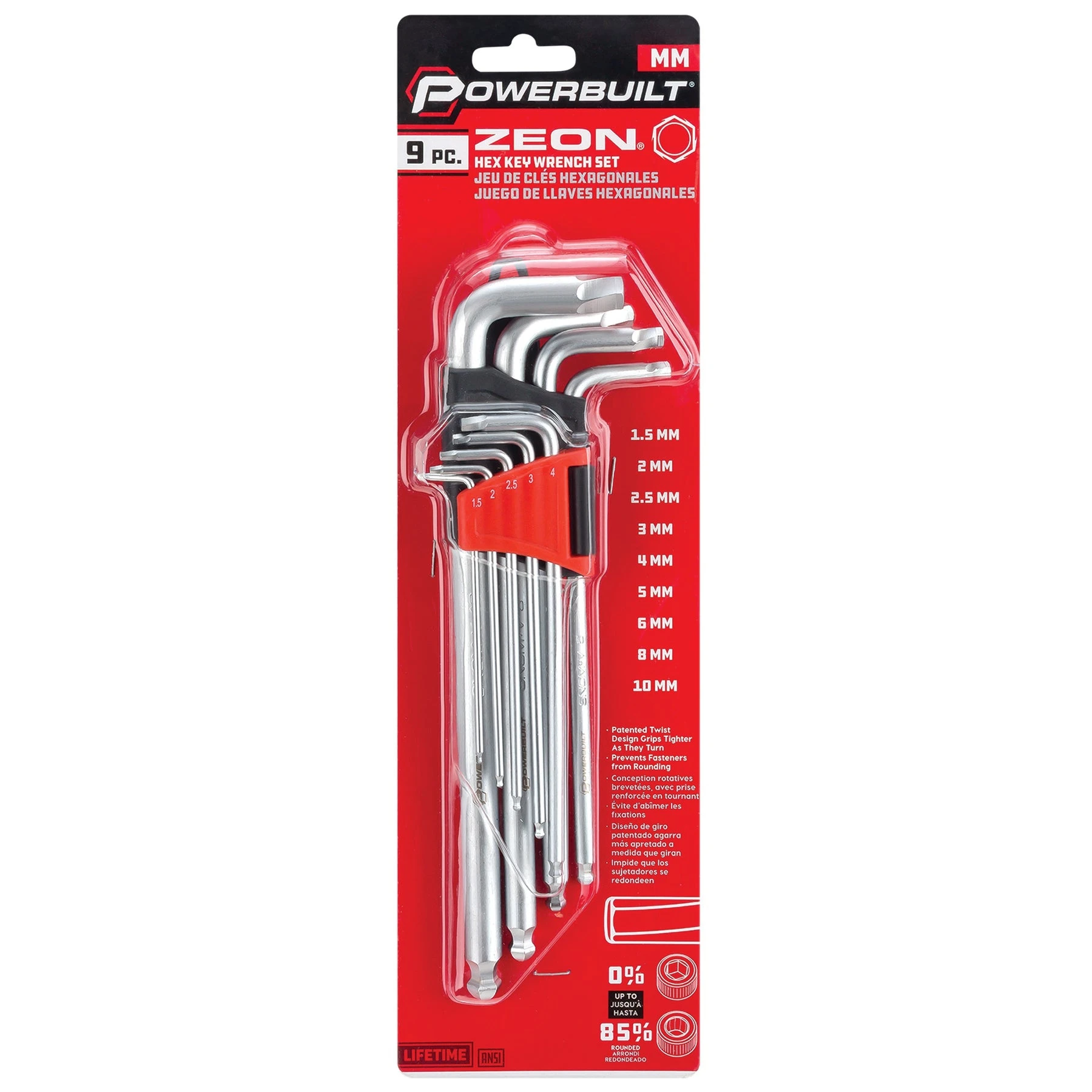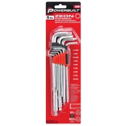Powerbuilt Zeon hex key wrenches are designed to grip and turn damaged and rounded hex head fasteners. The patented design will grip and turn hex surfaces up to 85% rounded. In other words, if you’ve got a hex head bolt or cap screw bolt that’s too damaged to turn with a regular hex bit socket or hex key wrench, these wrenches will get you out of a fix. And they work just as well on new, undamaged fasteners. The secret is the patented Zeon design – the more you turn them the harder they grab and hold damaged hex heads. They’re constructed of hardened 8660 steel for maximum strength and durability. They feature extra-long handles for applying torque to those stubborn fasteners. For added versatility, the long handle wrench ends are finished with a ball end hex key for use on new fasteners at angles up to 20 degrees.