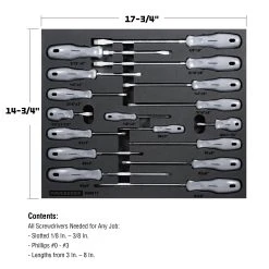 This line of Powerbuilt screwdrivers feature drivers that are built with single injection Acetate handles for maximum comfort and grip. Shafts are constructed of (SVCM) Silicon Vanadium Chrome Magnesium alloy steel for added durability and torque. Large size drivers have hex bolsters, and sizes are marked on the handle caps for easy size identification. All drivers exceed ANSI specifications for quality and performance.